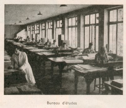 Mais, franchi le seuil de l'usine, on comprend aussitôt que, depuis longtemps, on a adopté ici les méthodes de travail et techniques les plus modernes, propres à assurer la parfaite régularité d'une production de qualité internationale, rivalisant avec celle des plus grandes firmes mondiales, et garantissant une interchangeabilité absolue. Organisation minutieusement étudiée et adaptée, qui s'est perfectionnée encore pour faire face aux extensions constantes depuis la Libération. Dans un ordre logique, la conception passe au premier plan.